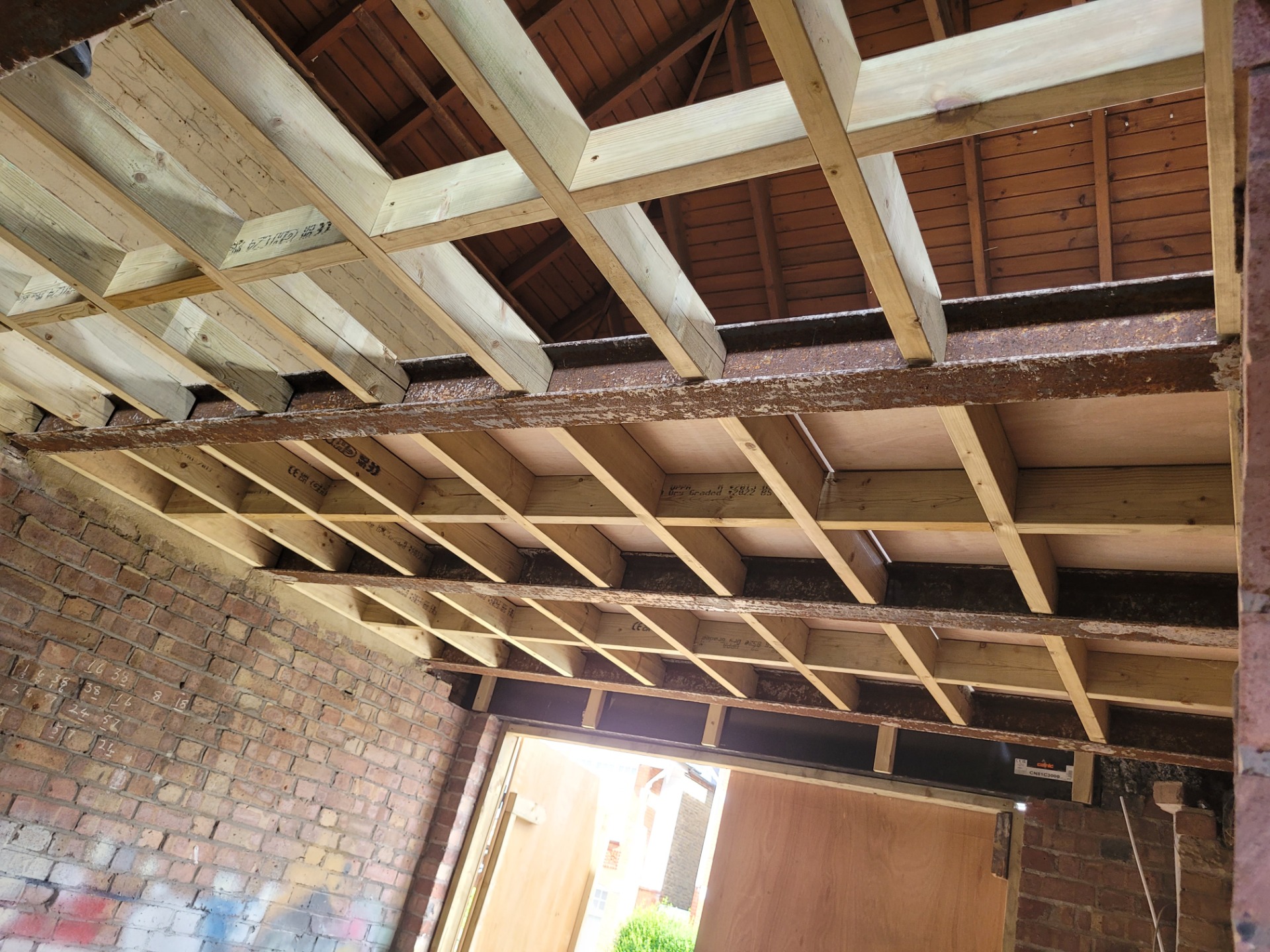 A new concrete base has been poured, steel beams have been put in to replace rotting wooden ones and the first floor flooring has been reinstated.